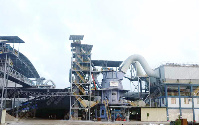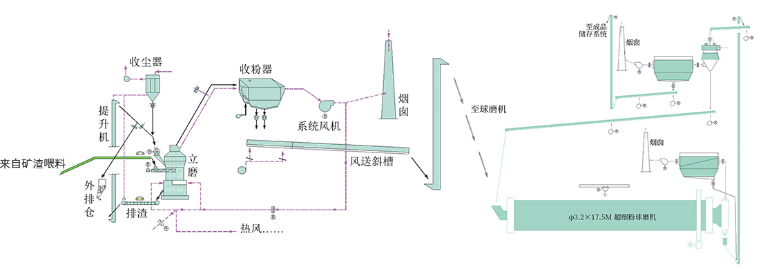 堆放著的礦渣由鏟車取料、喂料,通過皮帶機(jī)進(jìn)行輸送。在輸送過程中,礦渣原料先后經(jīng)由除鐵器和振動篩得到除鐵和篩分,然后通過稱重設(shè)備倉、提升機(jī)進(jìn)入立磨機(jī)進(jìn)行粉磨。粉磨后的礦渣借助熱風(fēng)爐提供的熱風(fēng),通過選粉機(jī)進(jìn)行選粉,同時得到烘干。符合細(xì)度要求的礦渣粉最后被輸送到收塵器收集、盛放后,由空氣輸送斜槽、提升機(jī)進(jìn)入成品庫中儲存。