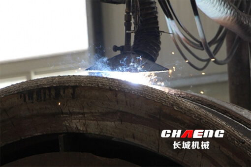 4、使用特種耐磨焊絲進行明弧自動焊,堆焊緩沖層和耐磨層,厚度12mm,表面花紋為一字紋或者菱形加點紋(客戶選擇)。保證外圓直徑達到圖紙要求。